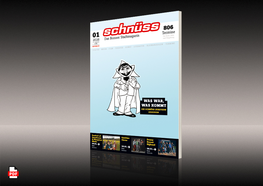| Musik Kunst Film Theater Kultur und Politik: Was ist los in Bonn? Das Stadtkulturmagazin Schnüss gibt Ihnen den aktuellen Überblick mit umfangreichem Veranstaltungskalender und aufschlussreichen Einblicken ins Bonner Geschehen. Jeden Monat gratis. In Bonn, für Bonn. |