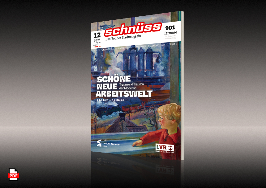 | Musik Kunst Film Theater Kultur und Politik: Was ist los in Bonn? Das Stadtkulturmagazin Schnüss gibt Ihnen den aktuellen Überblick mit umfangreichem Veranstaltungskalender und aufschlussreichen Einblicken ins Bonner Geschehen. Jeden Monat gratis. In Bonn, für Bonn. |