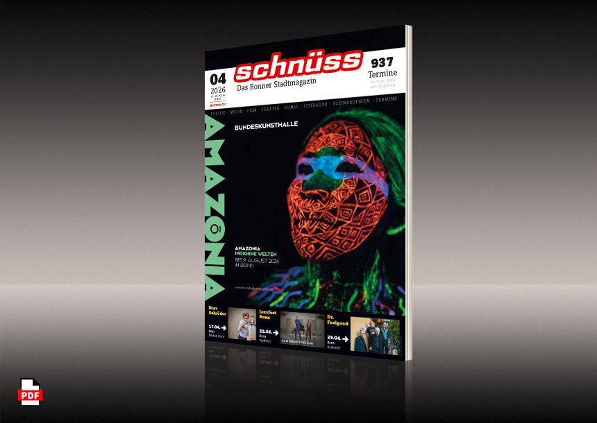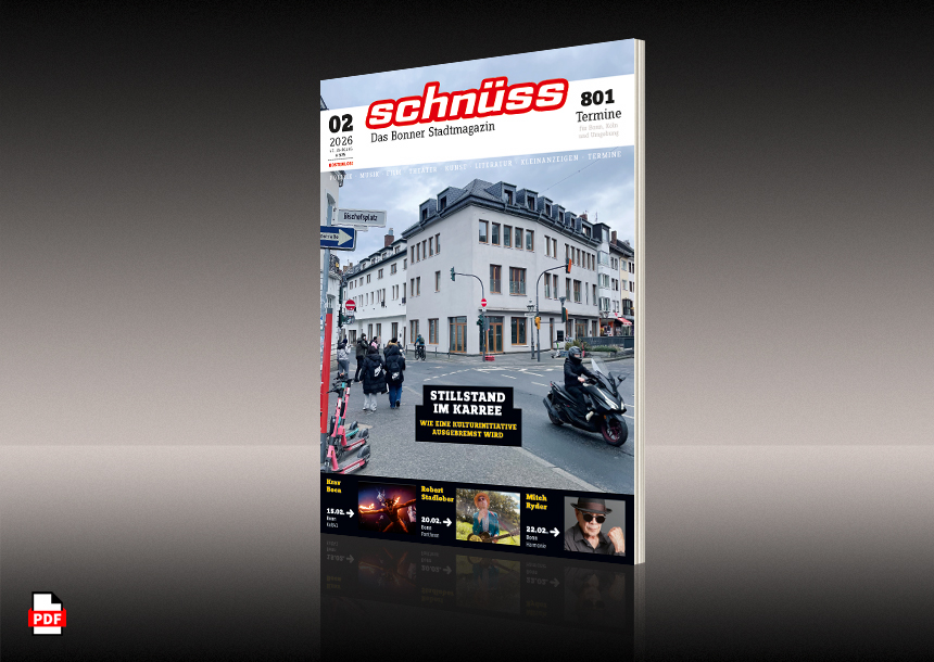 | Musik Kunst Film Theater Kultur und Politik: Was ist los in Bonn? Das Stadtkulturmagazin Schnüss gibt Ihnen den aktuellen Überblick mit umfangreichem Veranstaltungskalender und aufschlussreichen Einblicken ins Bonner Geschehen. Jeden Monat gratis. In Bonn, für Bonn. |